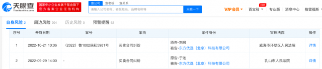 10月23日消息,天眼查App显示,近日,东方甄选关联公司东方优选(北京)科技有限公司新增一则开庭公告,案由为买卖合同纠纷,原告为刘某,该案于10月21日在威海市环翠区人民法院开庭。
