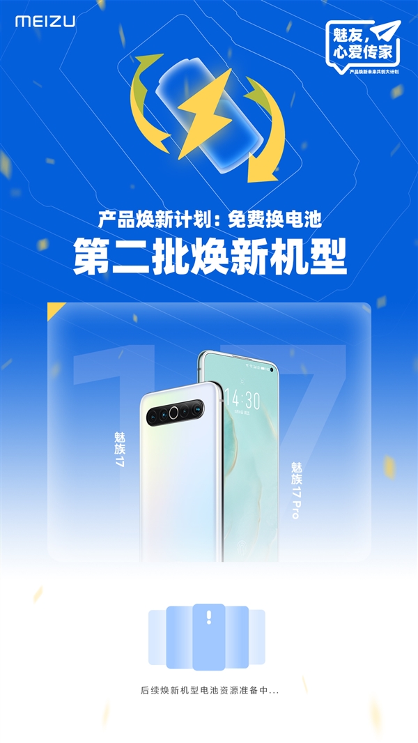 【ITBEAR科技资讯】8月2日消息,今天,魅族官方宣布,魅族17、魅族17 Pro将作为第二批机型参与免费电池焕新。自即日起15个工作日内,魅族将根据登记顺序联系用户安排免费电池更换,并有序推进新电池资源后续焕新的质检和采购。魅族也将会在第一时间与各位同步后续最新进度。