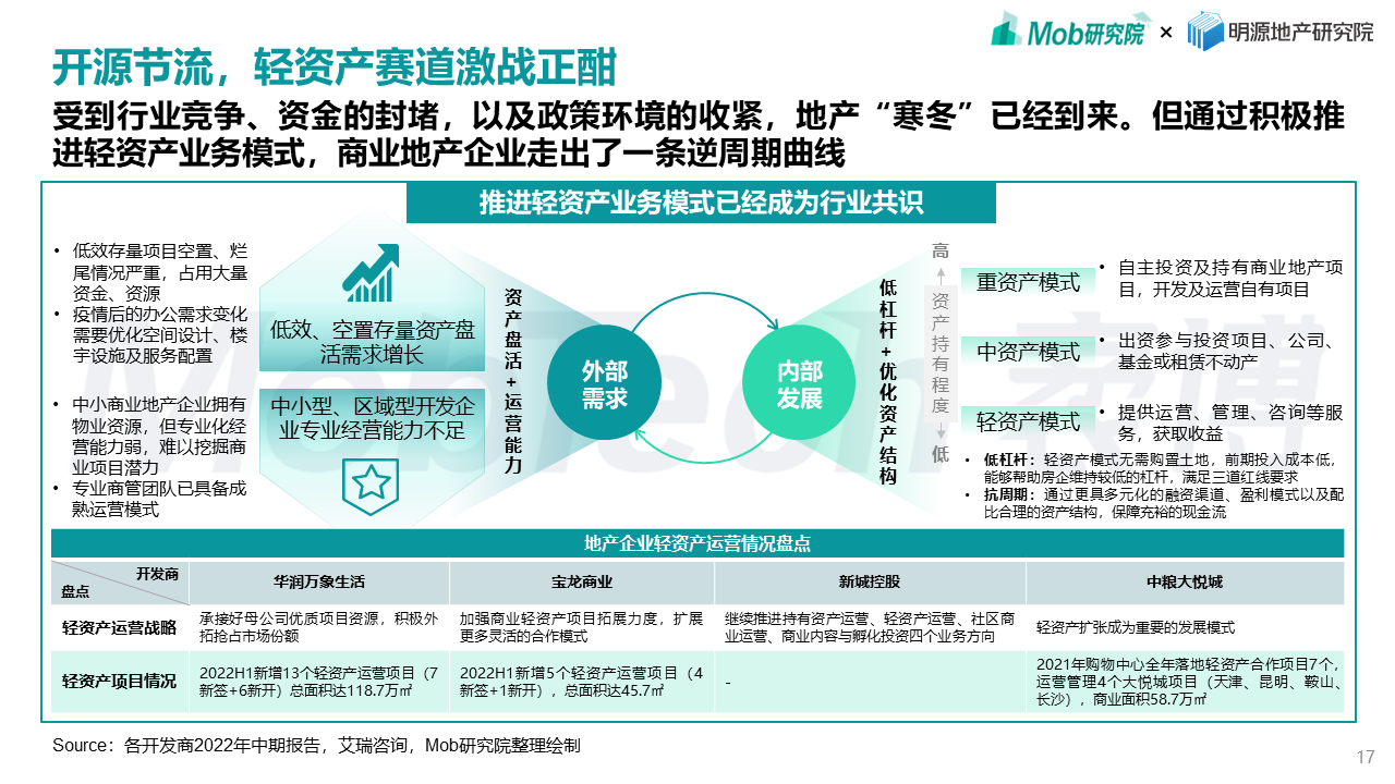受到行业竞争、资金的封堵,以及政策环境的收紧,地产“寒冬”已经到来。但通过积极推进轻资产业务模式,商业地产企业走出了一条逆周期曲线。华润万象生活提出“承接好母公司优质项目资源,积极外拓抢占市场份额”,宝龙商业提出“加强商业轻资产项目拓展力度,扩展更多灵活的合作模式”,中粮大悦城提出“轻资产扩张成为重要的发展模式”。