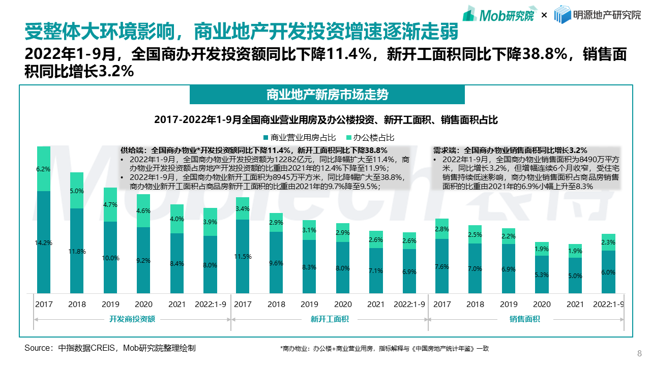 《白皮书》表示,2022年,受国内新冠肺炎疫情因素影响,我国经济下行压力明显加大,尤其是部分产业链、供应链受到冲击;部分区域接触型、聚集型特征明显的线下消费表现低迷,给实体商业经营带来挑战。从市场表现看,2022年1-9月,全国商办开发投资额同比下降11.4%,由于开发投资额的不足也导致新开工面积同比下降38.8%。虽然销售面积同比增长3.2%,但增幅已经连续6个月收窄。