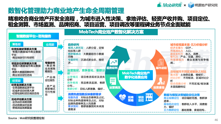 MobTech商业地产数智化解决方案精准咬合商业地产开发全流程,为城市进入性决策、拿地评估、轻资产收并购、项目定位、租金测算、市场监测、品牌招商、项目运营、项目调改等里程碑业务节点全面赋能。