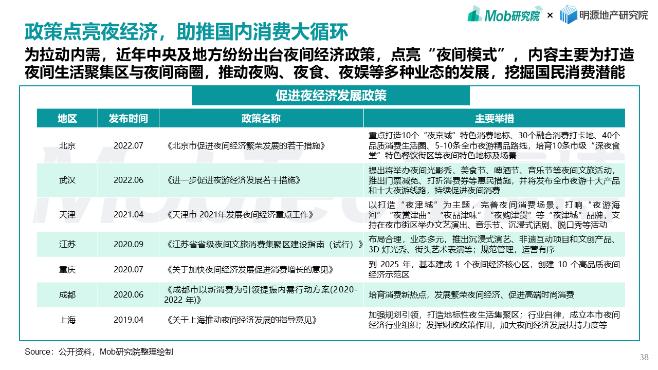 为拉动内需,近年中央及地方纷纷出台夜间经济政策,点亮“夜间模式”,内容主要为打造夜间生活聚集区和夜间商圈,推动夜购、夜食、夜娱等多种业态的发展,挖掘国民消费潜能。