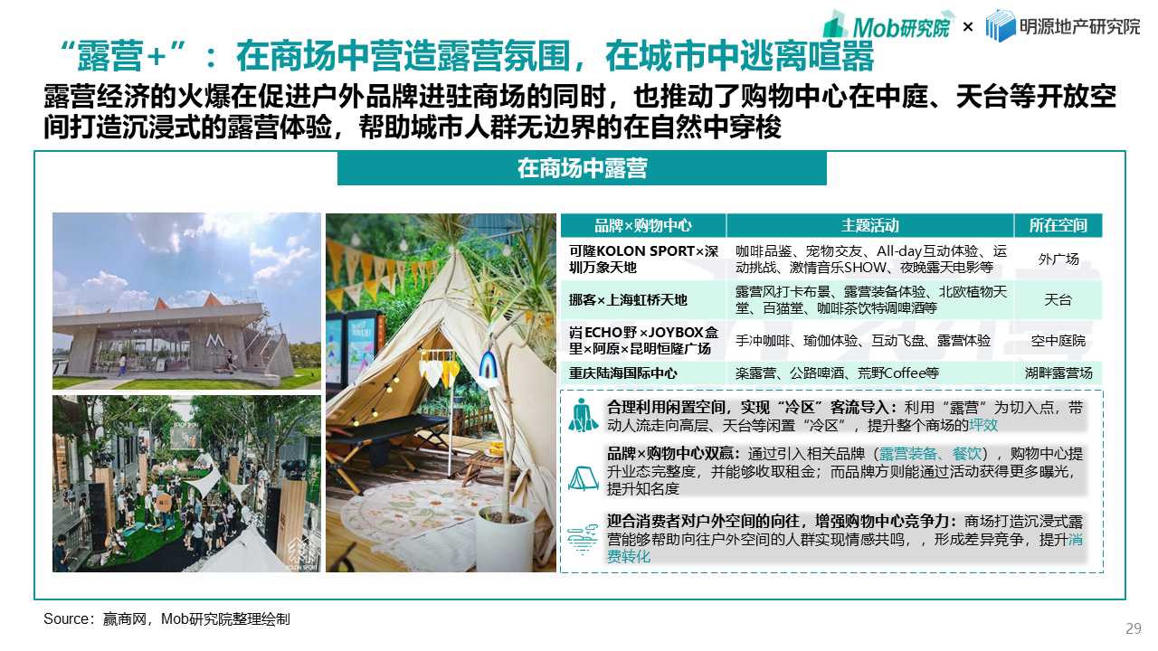 露营经济的火爆在促进户外品牌进驻商场的同时,也推动了购物中心在中庭、天台等开放空间打造沉浸式的露营体验,帮助城市人群无边界的在自然中穿梭。