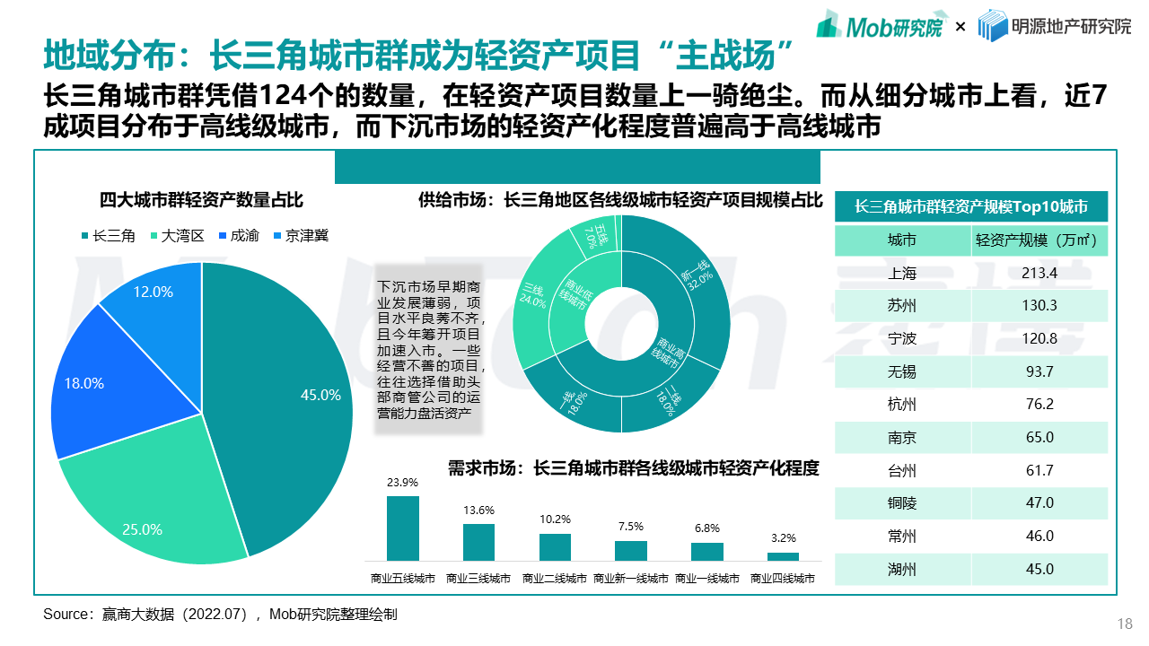 而长三角地区正在成为商业地产企业开展轻资产项目的“主战场”。从数量上来看,长三角城市群凭借124个项目,一骑绝尘,比第二名多了近一倍。而从细分城市上看,近7成项目分布于高线级城市,而下沉市场的轻资产化程度普遍高于高线城市。
