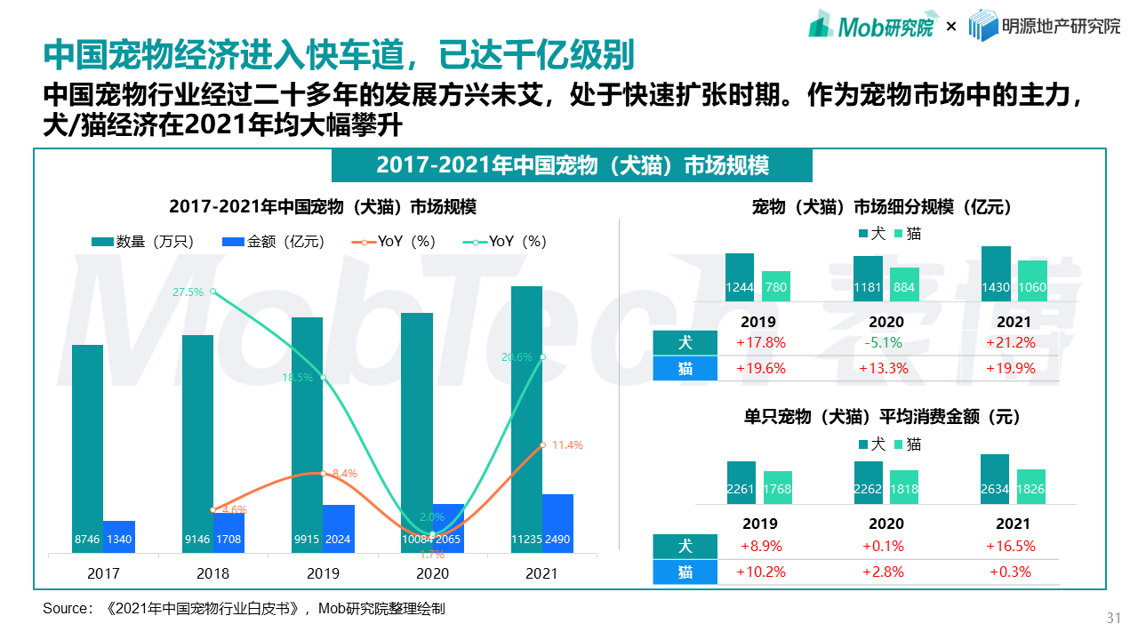 中国宠物行业经过二十多年的发展方兴未艾,处于快速扩张时期。作为宠物市场中的主力,犬/猫经济在2021年均大幅攀升。