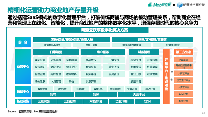 而通过搭建SaaS模式的数字化管理平台,明源云沃享能够帮助商企打破传统商铺与商场的被动管理关系,打造从前台-业务中心-数据中心的一整套解决方案,帮助商企在经营和管理上整体提升数字化水平,增强存量时代的核心竞争力。