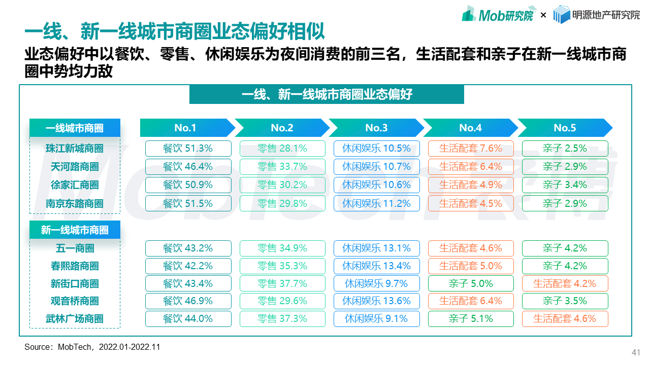 而业态偏好中又以餐饮、零售、休闲娱乐为夜间消费的前三名,生活配套和亲子在新一线城市商圈中势均力敌。