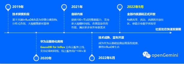 经过最初由InfluxDB改造的技术探索,openGemini已经经历了云服务商用、自研内核增强和开源等多个阶段的发展。它经受住了华为云内外部100余家用户不同业务场景的打磨和检验,现已开放全部核心源码,全面拥抱开源,打造共享、共治、共建的开发社区。
