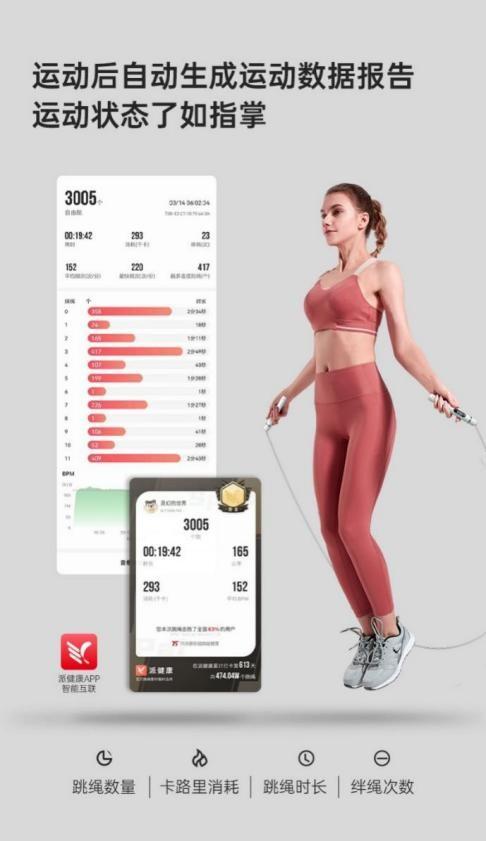 HIIT高强度间歇跳绳计划可以通过派健康APP设定,此外派健康APP还贴心提供了专业且免费的初级和高级跳绳HIIT两套课程,可满足不同用户不同运动强度水平的需求,方便大家随时跟练。同时,派健康APP还可以实时记录跳绳次数、时长、卡路里消耗、绊绳次数、最大连续跳绳次数、最快频次等维度的运动数据,更可以通过大数据进行智能运动分析和压力监测,还能够为用户提供健康运动指导,帮助用户可以在了解自己运动强度和运动水平的同时,制定循序渐进的健康运动计划,让日常运动健康状况一手掌握。