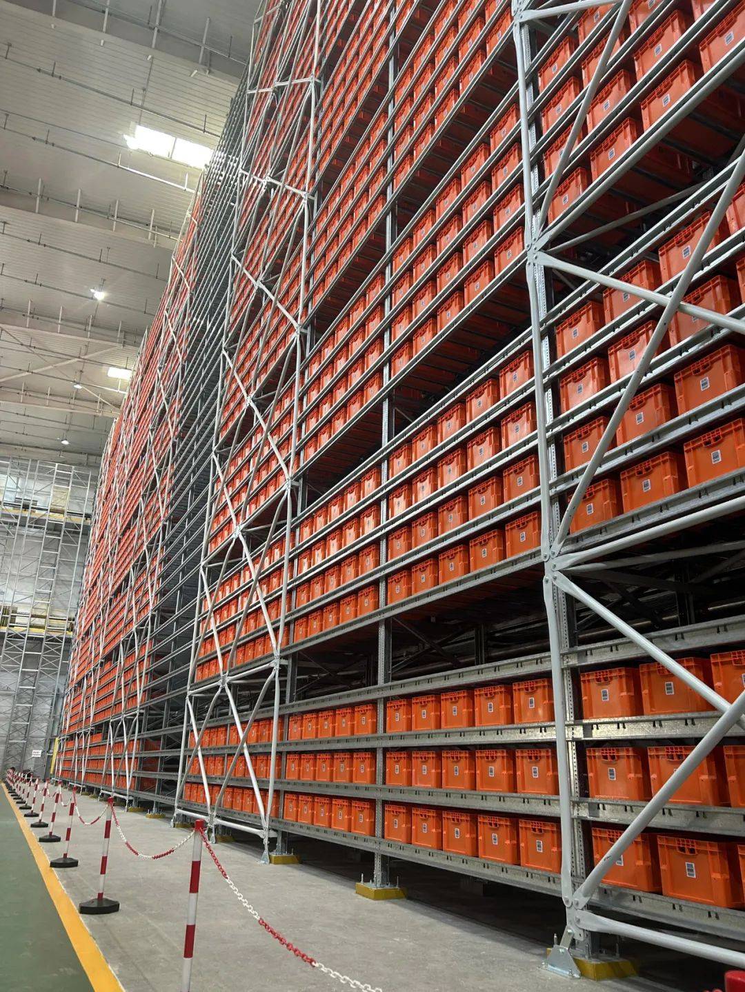 走进“东方一号”,迎面是一个净高20.5米的钢筋建筑,结构复杂,一个成年人在它面前微小如蚁,一侧装着满满当当的橙色料箱,另一侧是严严实实的蓝色托盘。