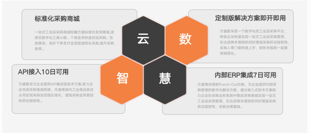 鑫方盛凭借多年在工业互联网的研究和实践,依托云计算,人工智能等前沿技术,更精确地推进企业采购策略升级,为合作企业提供数字化采购平台,构建采购商城、采购寻源、供应商协同、内部采购协同、运营管理、采购大脑6大解决方案,规范采购流程,提高采购效率,降低采购成本,加强采购协同。