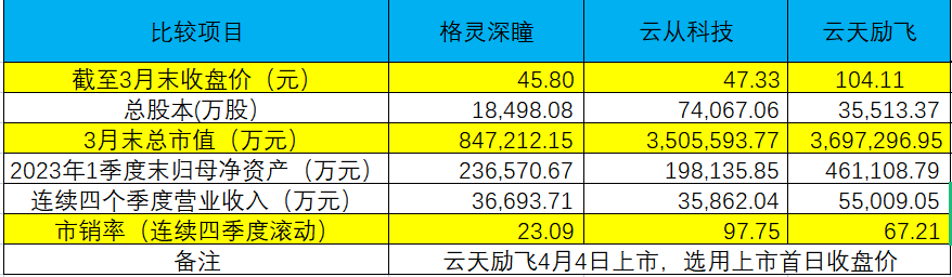 然而从市销率等估值指标来看,截至一季度末,虽然格灵深瞳的2022年度报告和2023年一季度报多项财务指标均强势领先,但格灵深瞳较云天励飞和云从科技的估值水平仍处于相对偏低的水平,市场潜力仍有待挖掘,或许随着前者盈利水平持续向好,资本市场会给出合理预期。