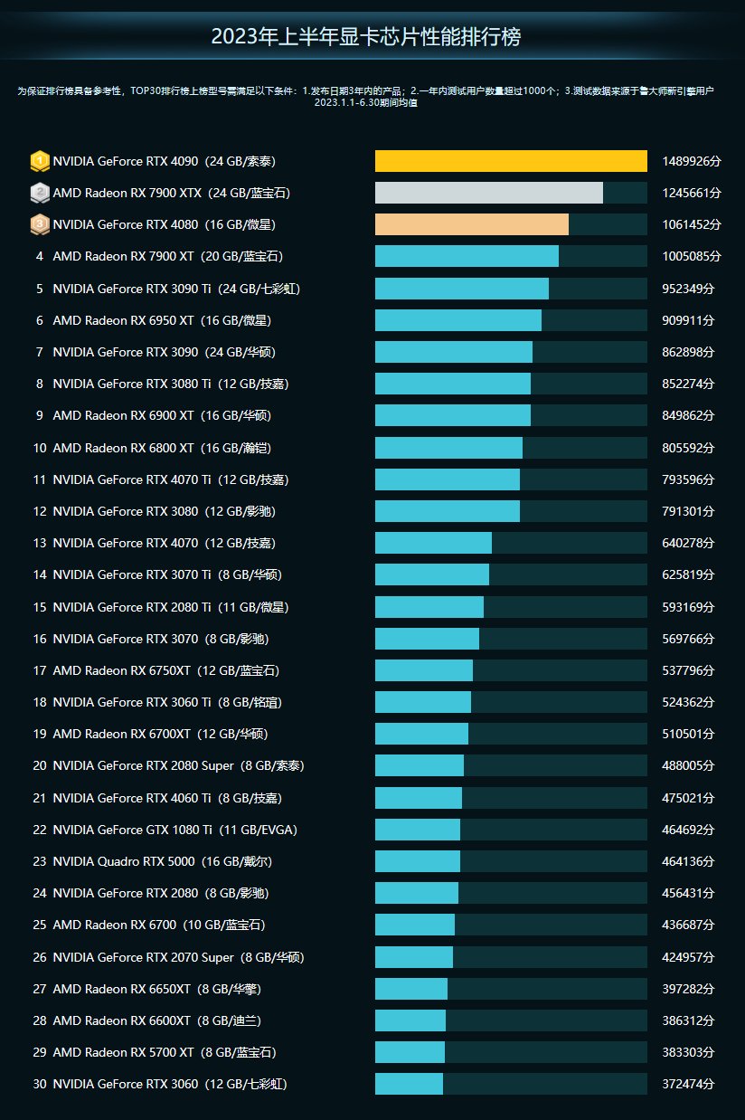 半年报中,显卡性能榜并无较大变化,依旧是NVIDIA GeForce RTX 4090以接近149W分数占据榜首,但价格依旧维持高位。