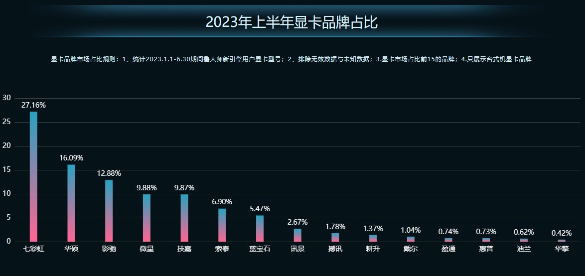 显卡品牌市场占比依然是以七彩虹和华硕领跑,占比分别为27.16%和16.09%;不过相比去年同期,七彩虹出现了较大降幅,降幅约为6个百分点;华硕、影驰、微星出现小幅上升。