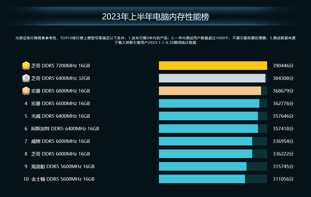 半年报中,芝奇 DDR5 7200MHz 16GB以390446分夺得榜首,拥有目前榜单上最高的7200MHz频率;第二名同样是芝奇旗下 DDR5 6400MHz 32GB,跑分成绩384308分;此外,宏碁、光威、海盗船、金士顿均有上榜。