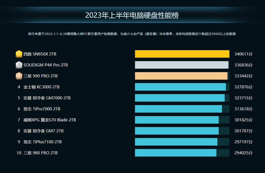 作为西数高端旗舰产品,SN850X凭借高达7300MB/s的顺序读取速度和6600MB/s的顺序写入速度拿下34W高分,并夺得2023年上半年性能榜第一。
