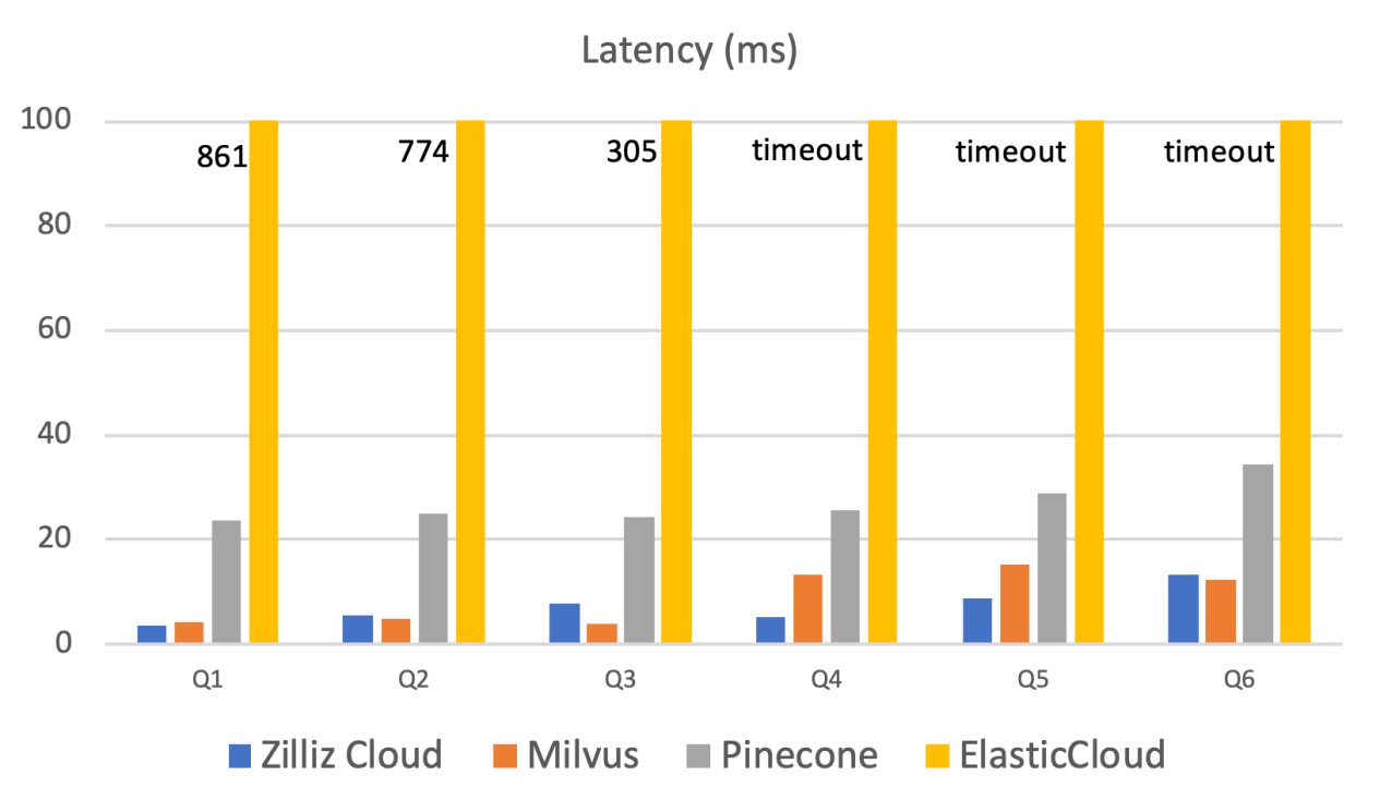 在查询吞吐方面,Zilliz Cloud 在全部6组查询任务中全面力压向量数据库 Pinecone,整体性能平均超越2倍以上。与此同时,Zilliz Cloud 相比 Milvus,也有将近一倍的提升,表现令人眼前一亮。ElasticCloud 作为传统文本检索服务的代表,向量查询能力主要为补充能力,这 6 组查询任务的 QPS 均在 50 以下。