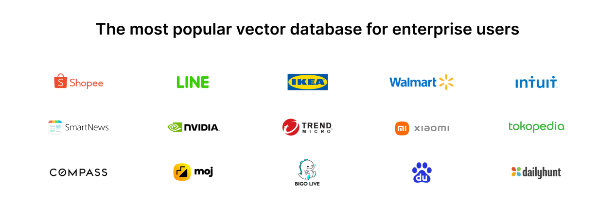 Milvus 自开源以来,一直都是企业用户自建向量数据平台的首选,全套技术解决方案已被上万家企业所采用,其中百度、新浪、理想汽车、华泰证券、沃尔玛、LINE、BIGO 等头部企业在实践中经过反复验证,均已顺利投产。