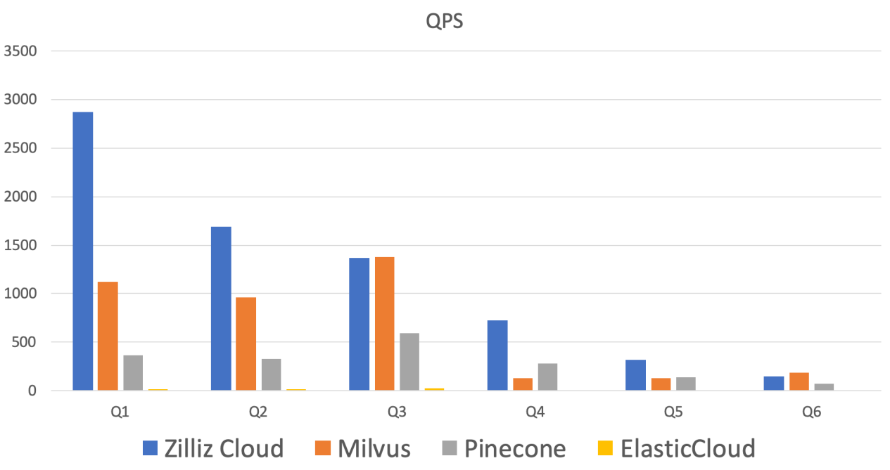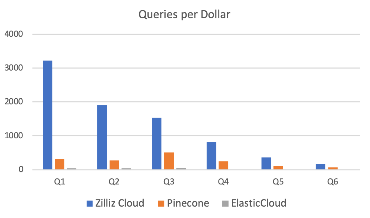 性价比方面,主要考察 Queries per dollar (高并发情况下,单位成本所能支持的查询请求数量)。相较 Pinecone、Elastic,Zilliz Cloud 的优势十分明显。指标相比第二位的 Pinecone 最多可以高出 1 个数量级(Q1, Q2),在剩下的四组任务中普遍可以高 3 倍左右。(由于 Milvus 为开源方案,难以和商业化服务在相同标准下比较,我们在这组测试中将其移除。)