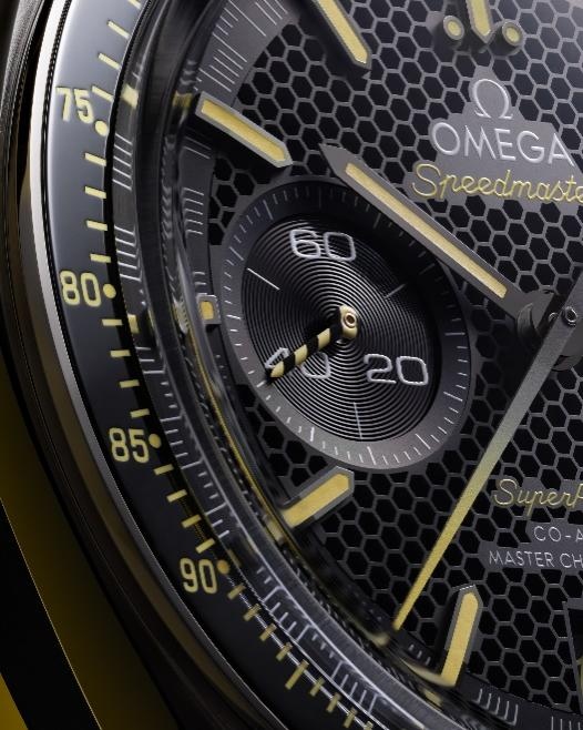 腕表表盘环绕有赛车风格的独特分钟圈,黑色陶瓷表圈上的标志性测速刻度由全新的黄色“大明火”珐琅制成。这一大胆醒目的黄色同样被用于渐变计时秒针、计时指针以及设于9点位的条纹小秒针上,旨在呼应诞生于2013年的海马系列Aqua Terra >15’000高斯腕表。60分钟和 12小时计时盘设于3点位,也可用来指示第二时区。表盘呈现“蜂巢”结构,灵感源自欧米茄博物馆展示的一款可抵抗160,000高斯极端磁场的概念腕表。
