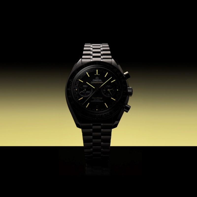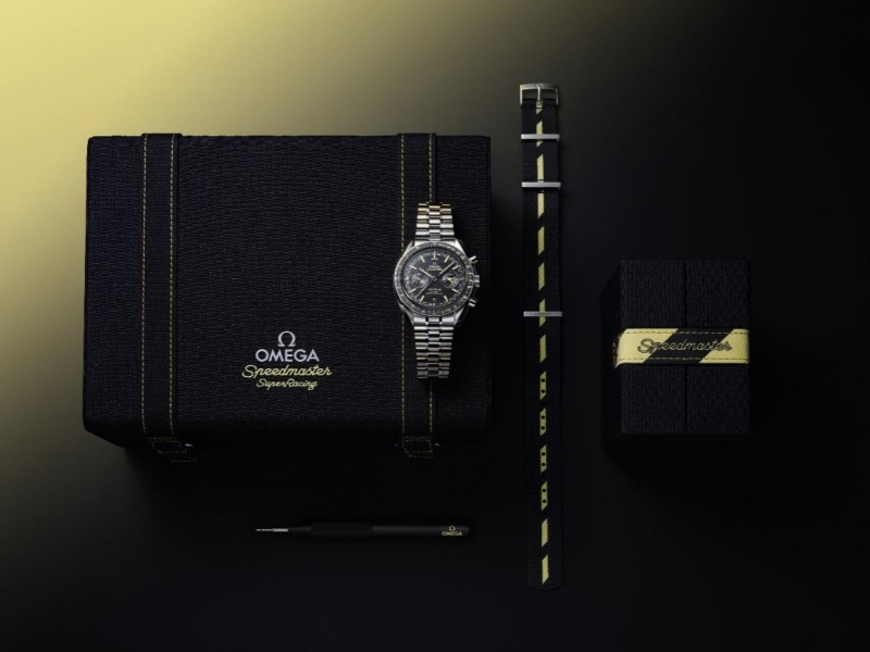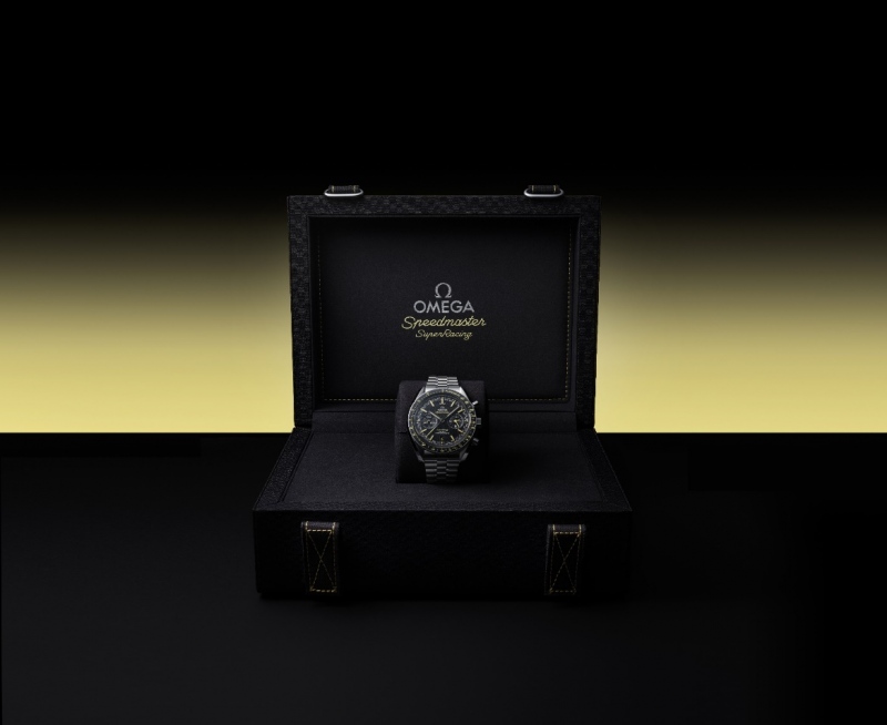 黑色箭形小时刻度经钻石抛光和倒角处理,覆以全新独特的Super-LumiNova夜光涂层,在黑暗环境中散发出让人惊喜的黄色夜光。表盘上的“Speedmaster”与“Super Racing”字样亦采用黄色。